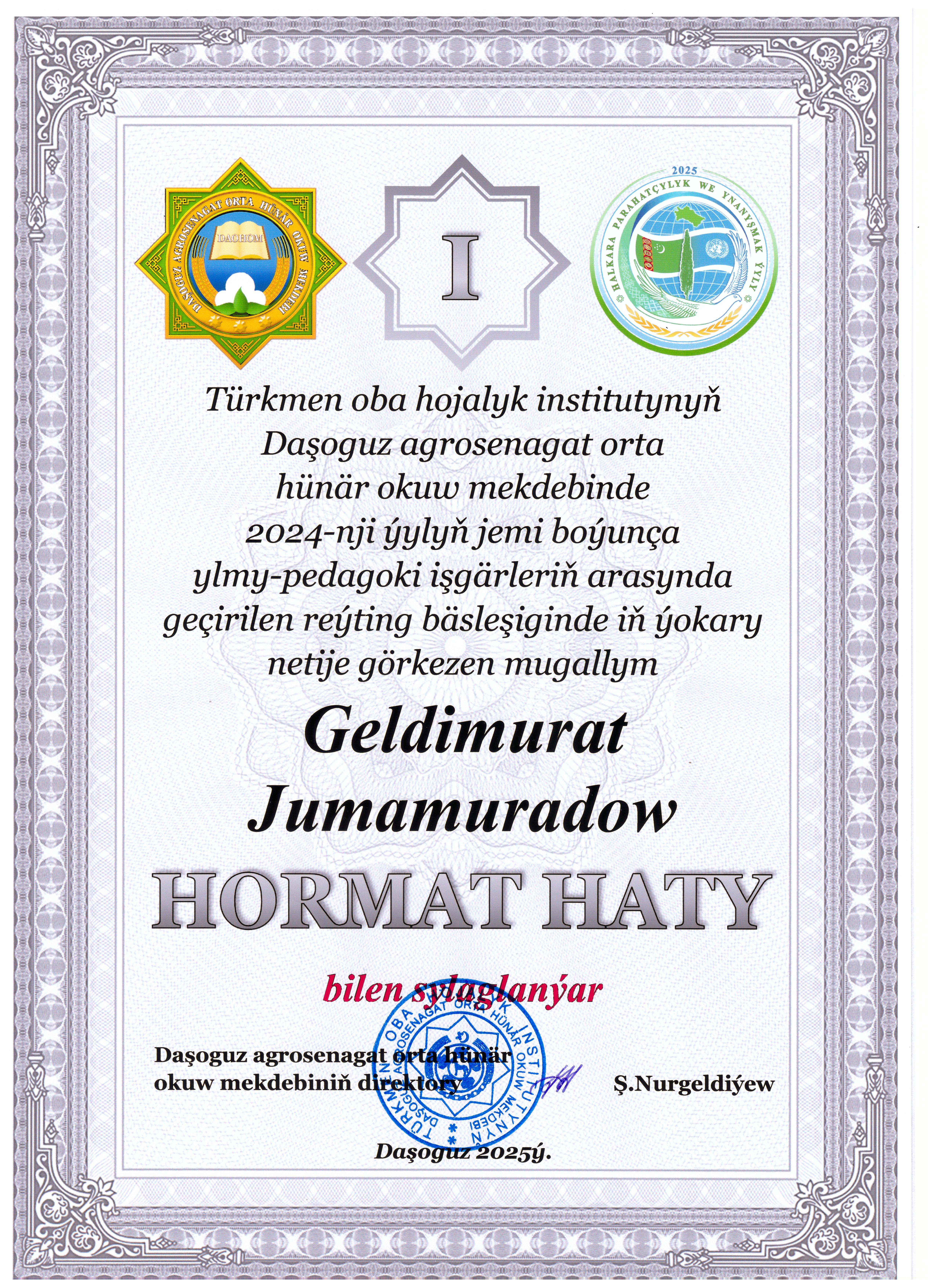 Tükmenistanyň Bilim ministriliginiň 2024-nji ýylyň 12-nji awgustynda №259 belgili buýrugyna laýyklykda Tükmenistanyň orta hünär okuw mekdepleriniň pedagogiki işgärleriň reýting bahalandyrmasynyň netijesi boýunça. Türkmen oba hojalyk institutynyň Daşoguz agrosenagat orta hünär okuw mekdebinde 2024-nji ýylyň jemi boýunça geçiren işleriniň netijesi boýunça mekdebiň Kompýuter tehnologiýasy dersleri usuly birleşmesiniň mugallymy Geldimurat Jumamuradow iň ýokary netije görkezip birinji orna mynasyp boldy.