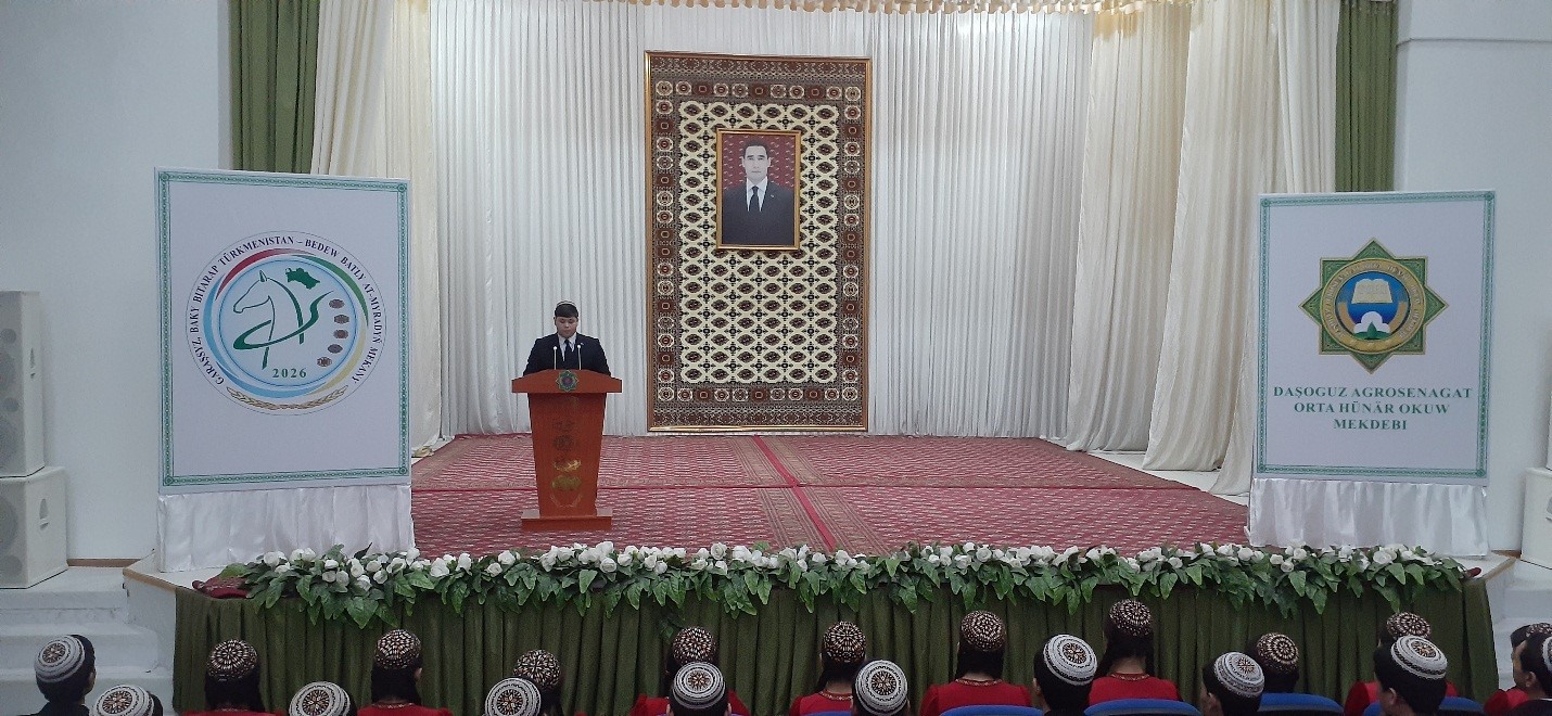 Ýanwar aýynyň 14-ne Daşoguz agrosenagat orta hünär okuw mekdebiniň hem-de Türkmenistanyň Demokratik partiýasynyň Şabat etrap komiteti bilen bilelikde gurnamagynda Daşoguz welaýatynyň Täze oba medeniýet öýünde “Garaşsyz, baky Bitarap Türkmenistan bedew batly at-myradyň mekany” ýylyny dabaralandyrmak maksady bilen aýdym-sazly dabara geçirdi. Dabarada mekdebiň mugallymlarynyň we talyplarynyň, şeýle-de jemgyýetçilik guramalaryň wekilleriniň çykyşlary diňlenildi. Onda çykyş edenler mukaddes Garaşsyzlygymyzyň 35 ýyllyk toýunyň bu şanly senede belleniljekdigi, hemişelik Bitaraplygymyzyň 30 ýyllygynyň dabaralara, üstünliklere beslenip şanly seneler bilen dowam edýändigi dogrusynda, ýurdumyzda dost-doganlygyň, parahatsöýüjiligiň öňe sürülýändigi barada çykyşlar diňlenildi. Bu şanly ýylymyzyň bedew batly üsünliklere beslenjekdigine hem-de talyp ýaşlar ýylymyzyň şygaryna bedew atymyzyň keşbiniň öwüşgün çaýýandygyny çykyşlarynda uly buýsanç bilen belläp geçdiler. Dabaranyň ahyrynda oňa gatnaşanlar ýurdumyzda okamak, işlemek üçin döredilýän mümkinçilikler üçin Türkmen halkynyň Milli Lideri Gahryman Arkadagymyza Arkadagly Gahryman Serdarymyza köp köp sagbolsun aýtdylar. Medeniýet we sungat işgärleriniň ýerine ýetirmeginde aýdym-sazlar belentden ýaňlandy.